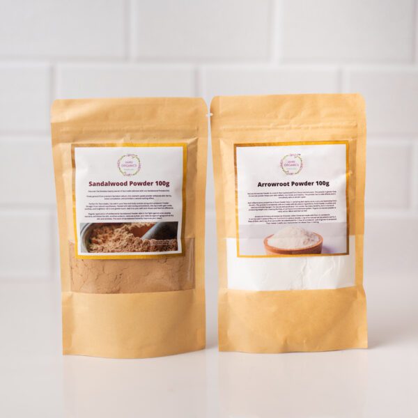 | Natural Talcum Powder, Natural Face/Body Powder Combo has 100g of arrowroot powder and 100g of sandalwood powder.